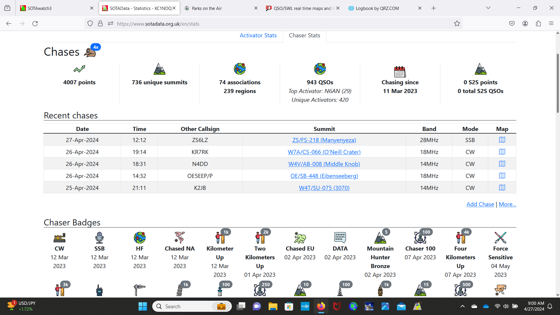 Moved past 4000 chaser points this morning with my 953 SOTA contact with ZS6LZ on a mountain in South Africa this morning on 10m SSB. Made my day!