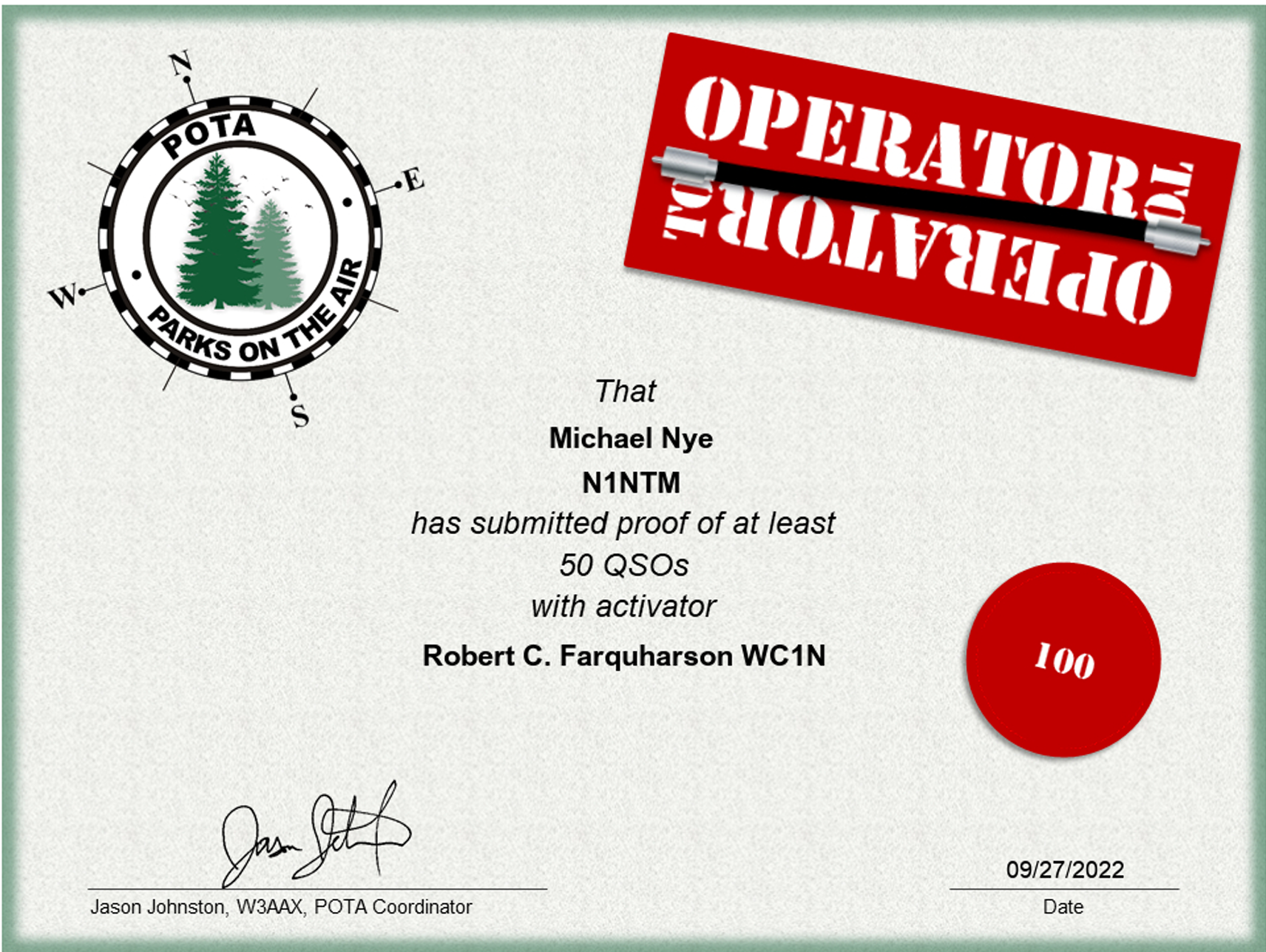 POTA Operator To Operator Certificate For PAWA Team Members N1NTM / WC1N